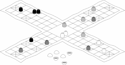 Patolli was played by a wide range of pre-Columbian Mesoamerican cultures and was known all over Mesoamerica. It’s claimed to have originated by the Teotihuacanos around 200 BC - 650 AD. Patolli is a racing game with a heavy focus on gambling. Players would meet and inspect the items each other had available to gamble. Agreeing to play against someone was not done casually, as the winner of the game would ultimately win all of the opponent's store of offerings. The play area had a similar setup to Pachisi with an "X" shape layout where beans/tokens traveled around the board. The object of patolli is to move six game pieces to the end of a board composed of specially-marked squares. In order to complete a round, a player must get all six of their beans from their starting queue to the ending square before the other player (3).